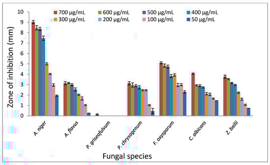 TPL extract ranged from 50–700 μg/mL, showing a higher overall inhibition (2–9 mm) against A. niger followed by F. oxysporum (2.3–5.1 mm), C. albicans (1.46–4 mm), Z. bailii (0.73–3.76 mm), P. chrysogenum (0.46–3.1 mm) and A. flavus (0.26–3.1 mm) under the same conditions. Interestingly, the F. oxysporum showed an almost constant diameter zone of inhibition over all tested TPL extract dilutions, which may indicate its high susceptibility to TPL extract. Conversely, TPL extract showed poor potency against P. griseofulvum spores with a < 0.1 mm zone of inhibition.