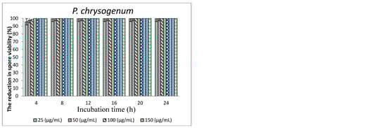 The effects of polygodial concentrations in TPL extract and incubation periods on the spore viability of pathogenic and spoilage fungi are shown in Figure 2. The spores of F. oxysporum and C. albicans were very sensitive to all polygodial concentrations at all incubation periods with total inhibition (100%) (data not shown in graph). In contrast, the spores of A. niger, P. chrysogenum, and Z. bailii were inhibited at all polygodial concentrations when incubated for 8 h. At low concentration, this ranged from 25–100 µg/mL, and more than 93% reduction of spore viability of A. niger, A. flavus, P. chrysogenum, and Z. bailii was achieved after 4 h of incubation.