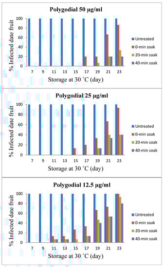 Other concentrations of TPL extract (corresponding to 25 µg/mL polygodial) showed 15 days of shelf life with no soaking and 19 days for soaked fruits, while 12.5 µg/mL polygodial extended for only 11 days for soaked fruits and 7 days for non-soaked fruits under the same conditions. Overall, the shelf life of fresh dates treated by TPL extract at the concentration of 50 µg/mL polygodial at a storage temperature of 30 °C and soaking for 40 min was extended up to 21 days and was found to be the best results from the current study. The current work also clearly demonstrates that TPL extract containing polygodial has activity against a range of pathogenic and food spoilage fungi. Therefore, TPL extract can potentially extend shelf life or improve the safety of fresh dates. However, the wide variation in levels and range of activity also indicates that the application of the TPL extract will strongly depend on the specific fungal problem to be addressed.
