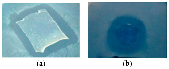 Example of anti-Listeria activity, detected by agar diffusion assay. After incubation at room temperature for 24 h, the antagonistic activity was quantified by a clear zone of inhibition in the indicator lawn around both active film (a) and coating (b).