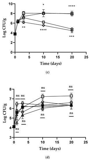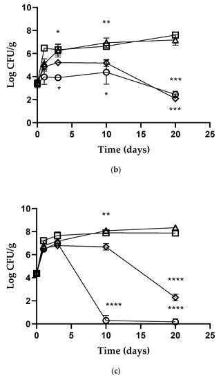 Listeria monocytogenes NCTC 10888 viable counts (log CFU/g) observed in the contaminated (a) carrots, (b) tomatoes, and (c) zucchini samples packaged in PoAF [🞅], PoAC [♢], PoF control [△] and PoC control [☐]. Lactobacillus kefiri (d) viable counts (log CFU/g) observed in the contaminated carrots, tomatoes, and zucchini samples packaged in PoAF [🞅, △,