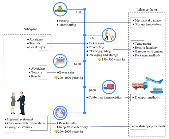 To understand the matsutake quality changes in the cold chain, a matsutake logistics survey revealed that the main processes are: picking, pre-cooling and cleaning/grading, packaging and storage, cold-chain transportation and sales [19]. Figure 1 shows the specific Tibetan matsutake post-harvest logistics process. Mechanical damage and environmental temperature were the most important factors affecting matsutake quality, so it was necessary to control temperature, monitor parameters, choose appropriate packaging methods, avoid damage and extend the shelf life. The pre-cooling temperature, environment, relative humidity, packaging methods and transportation methods had different effects on the matsutake quality changes.