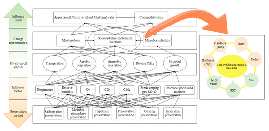 According to the analysis of the post-harvest quality change mechanism, the main factors affecting the matsutake post-harvest quality are the temperature and relative humidity in the storage environment, O2, CO2 and ethylene gas concentrations in the micro-environment, and microorganisms. The physiological activities lead to moisture loss and microbial infection, thus affecting the sensory and physicochemical indicators and, consequently, the appearance, nutritive value, medicinal value and commodity value. The sensory indicators include the hardness (cap and rod), color and odor. The physicochemical indicators include the pH value, soluble solids content (SSC) and moisture content (MC). As time increases, the odor of the matsutake gradually fades, browning occurs on the surface and spoilage produces off-flavors and moldy spots. The hardness decreases with storage time because the matsutake rots and deteriorates before opening its umbrella.