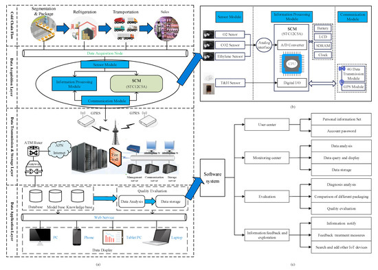 (a) The overall structure of the matsutake cold chain monitoring and tracing system; (b) the design of the hardware system structure; (c) the design of the software system structure.