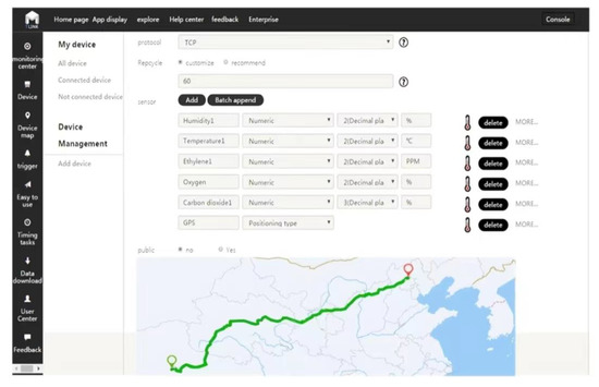 The design of the software system structure is shown in Figure 3c. The software is developed based on the IoT’s TLINK cloud service platform, which is an extension of the connectivity tool that provides real-time connectivity to millions of sensing nodes and supports standard protocol integration for IoT such as MQTT (Message Queuing Telemetry Transport), SEP (Spanning Tree Protocol), etc. It supports open API (Application Programming Interface) interfaces for the secondary processing and development of data. The IoT-based TLINK cloud service platform application software allows users to monitor the cold chain environment in real time and query the historical data of the cold chain environmental information. The overall software structure includes the user center, monitoring center, and the evaluation, information feedback and exploration modules. According to the requirements of multi-parameter information collection and fusion, multi-sensor integration of the temperature, humidity, and gas (O2, CO2 and ethylene) was realized. Users set personal information and account passwords via the user center; then, data query and display, data analysis and data storage are run in the monitoring center module; after that, the evaluation module evaluates the quality, based on diagnosis rules, and the information feedback module notifies users and feeds back their treatment measures. Finally, users can search and add other IoT devices to the exploration module.
