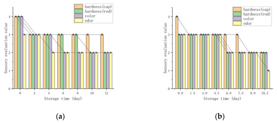 The four sensory evaluation indicator changes with the different packaging methods are shown in Figure 6. The evaluation value of the four sensory indicators of the matsutake decreased with time, and the odor, which is a sensitive indicator, decreased the fastest. The cap hardness in the 4 °C refrigerated preservation packaging experiment was lower, compared to the remaining three groups, and the rod hardness in the modified atmosphere packaging experiment decreased slowly and was relatively high overall. The sensory indicators of the matsutake remained good in the first 4 days and decreased faster from day 5 to day 10, and the individual variability of the matsutake became greater after day 10. The shelf life of the matsutake under the four experimental conditions was 12 days, 10.5 days, 18 days and 9 days, respectively. In the refrigerated preservation packaging experiments, it was found that, although the shelf life of matsutake was longer at 0 °C, frost damage occurred. Considering the losses and refrigeration costs, it is more appropriate to store the matsutake in an incubator at 4 °C under the conditions of this experiment.