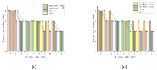 Matsutake sensory evaluation indicator changes with the different packaging methods: (a) refrigeration preservation packaging at 0 °C; (b) refrigeration preservation packaging at 4 °C; (c) modified atmosphere packaging; (d) preservative preservation packaging.