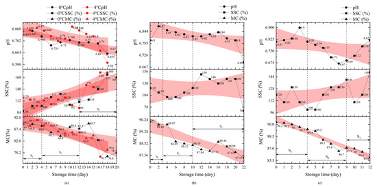 Figure 7c shows the matsutake physicochemical indicator changes with the preservative preservation packaging, which can be divided into three stages: S1, S2 and S3. In the S1 stage, the pH value increased, and the SSC and MC decreased. In the S2 stage, the pH value and the MC decreased; the SSC increased. In the S3 stage, the matsutake individual quality differences increased significantly, and there was a large data fluctuation. In the S2 stage, the continued decrease in MC resulted in a relative increase in SSC, and the MC was linearly negatively correlated with the SSC. It can be observed that, under the conditions of this experiment, the matsutake quality can be assured in the early preservation stage (0–5 days); after the fifth day, the matsutake quality decreased rapidly. Under the conditions of this experiment, the matsutake pH value was maintained between 6.67 and 6.9, with a variation interval of about 0.2, during the shelf life. The SSC was maintained between 1.00% and 1.50%, with a variation interval of about 0.50. The MC was maintained above 85.9%.