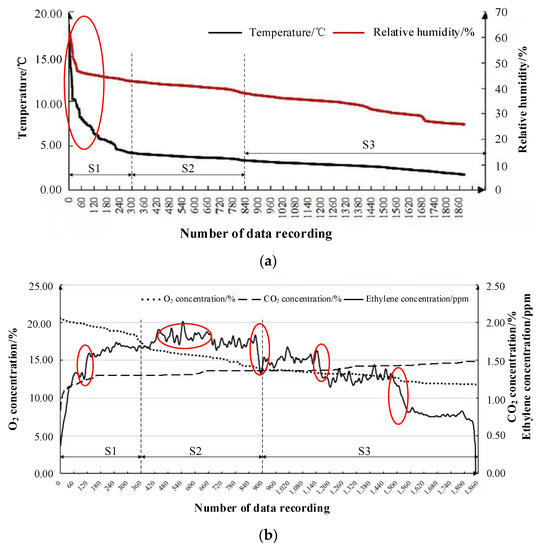 In this experiment, the matsutake micro-environmental parameters in the cold chain were characterized at 2–5 °C. The temperature and relative humidity changes and gas environment changes in the matsutake storage micro-environment were measured. The sensors used for measuring the temperature and relative humidity, O2, CO2 and ethylene were SHT11, SHT11, AJD-4M-O2, AJD/L/4CO2 and A15-75D, respectively. Due to the large sample size and the data reproducibility obtained in the experiment, the moving average method was selected to smooth the obtained data, according to one step for every ten data units when processing the data, and the data unit was 10 intervals. The whole monitoring process can be divided into three stages: S1, S2 and S3.