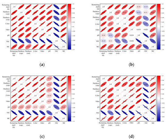 Correlation coefficients between matsutake quality indicators and remaining shelf life: (a) refrigeration preservation packaging at 0 °C; (b) refrigeration preservation packaging at 4 °C; (c) modified atmosphere packaging; (d) preservative preservation packaging.