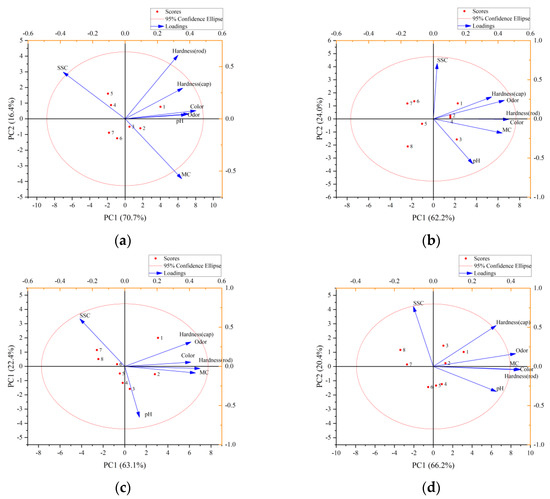 The red ellipse represents a 95% confidence interval, which verifies the feasibility of the cluster analysis method. In this paper, the quality indicators of the matsutake were divided into two categories, namely, two cluster centroids were obtained, and finally two comprehensive indicators were obtained: cluster 1(PC1) and cluster 2(PC2); PC1 and PC2 contained most of the information of the original data. It is easy to see that the SSC has a strong positive correlation with PC2, the MC and pH have a negative correlation with PC2. The hardness (cap, rod), color and odor have a strong positive correlation with PC1. Therefore, the seven quality indicators were divided into physicochemical categories to represent the matsutake shelf life. The physical indicators, including the rod hardness, color and so on, accounted for the most important proportion (~70%), while the chemical indicators, including the SSC, pH and so on, had less influence (~20%).