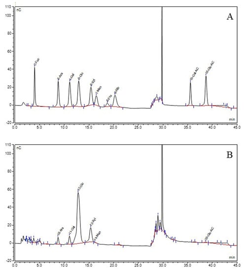 Chromatogram of standard monosaccharide (A) and component monosaccharides released from BSPs (B).