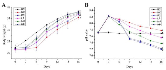 During the experiment, the bodyweights of mice were measured every 3 days. The pH values of mice feces were determined with a portable pH meter (METTLER—Toledo, Shanghai, China) every 3 days.