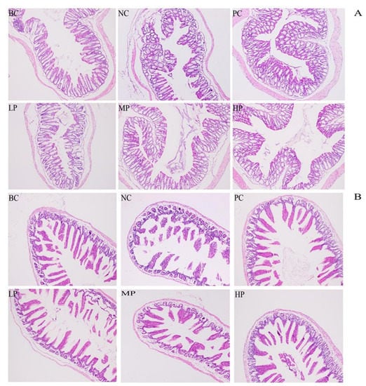 Histopathological observation of the colon (A) and small intestine (B) (100×). BC (blank control) represents healthy mice; NC (negative control) represents AAD mice without treatment; PC (positive control) represents AAD mice administrated with 200 mg/kg BW of inulin; LP, MP and HP represent AAD mice administrated with low-dosage (100 mg/kg BW), middle-dosage (200 mg/kg BW) and high-dosage (400 mg/kg BW) of BSP, respectively.