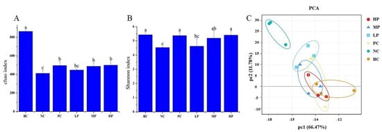 The analysis of abundance and diversity of the gut microbiota: (A) Chao index; (B) Shannon index; (C) principal component analysis (PCA) score plot. BC (blank control) represents healthy mice; NC (negative control) represents AAD mice without treatment; PC (positive control) represents AAD mice administrated with 200 mg/kg BW of inulin; LP, MP and HP represent AAD mice administrated with low-dosage (100 mg/kg BW), middle-dosage (200 mg/kg BW) and high-dosage (400 mg/kg BW) of BSP, respectively. a–c: Graph bars marked without the same letters differed significantly (p < 0.05). The values are expressed as means ± S.D.