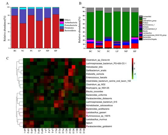 Composition of the gut microbiota represented by the stacking histograms at phylum level (A) and genus level (B), as well as a heatmap at species level (C). BC (blank control) represents healthy mice; NC (negative control) represents AAD mice without treatment; PC (positive control) represents AAD mice administrated with 200 mg/kg BW of inulin; LP, MP and HP represent AAD mice administrated with low-dosage (100 mg/kg BW), middle-dosage (200 mg/kg BW) and high-dosage (400 mg/kg BW) of BSP, respectively.