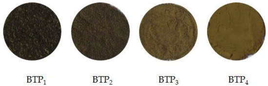 As displayed in Table 1, significant changes in color appearance were observed among BTPS. With the decrease in particle size, the values of L and b increased remarkably, while a increased at first then decreased. Negative correlations were observed between D50 and L (r = −0.992, p < 0.01) and b (r = −0.968, p < 0.05). The results were partly in agreement with the work of Chu et al. [23], who produced the black tea powder samples with D50 of 26.12 μm, 9.61 μm, 4.34 μm, 3.74 μm and 3.33 μm. In their study, with the reduction in particle size, the L values increased from 43.96 to 52.07, the b values increased from 28.42 to 32.30, while the a values were between 8.16–8.71 with no obvious difference. However, in our study, the a values for organ- and tissue-scale powders were between 7.72–8.19, while it remarkably decreased to 5.97 for cell-scale powders. Furthermore, the ∆E values were 22.14, 29.84, 33.86 and 39.63 for BTP1, BTP2, BTP3 and BTP4, respectively. An increase in the total color difference value was observed with a particle-size reduction for BTPS. For BTP4, the enhancement in brightness, yellowness and greenness was especially obvious (Figure 1). The processing of black tea involves withering, rolling, fermentation and drying [24], which results in its dark brown surface color. However, pulverizing at a cell-scale ruptured the surface cutin, wax, tissue and cell wall structure, and exposed the internal components [9], resulting in the bright and desirable color appearing on the particle surface.