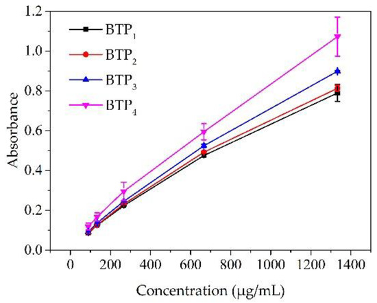 The analyses of ferric-ion-reducing antioxidant power (FRAP) are shown in Figure 4. The results showed that the FRAP increased with the increasing concentration of tea powder solution, as a result of the large amount of antioxidant components in the solution. Moreover, the FRAP was negatively correlated with D50 (r = −0.950, p < 0.05). In addition, the FRAP for BTP4 was significantly higher than that of BTP1, BTP2 and BTP3. According to previous research, the polyphenol content was associated with the FRAP. Furthermore, the rupture of plant tissues and cell structures could expose and release the inner phenolic substances, resulting in the enhancement for FRAP [31], which was consistent with the results of the current study. Overall, the particle microstructure and the antioxidant composition both contributed to the enhancement of FRAP for cell-scale powders.