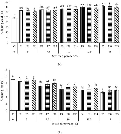 Figure 1b demonstrates the cooking loss of all the noodles samples. The cooking loss was observed to decrease significantly (p < 0.05) with the increase of SP from 7.5 to 15% in the formulation compared to the control sample (C). Nevertheless, results revealed that incorporating 5% of SP did not significantly decrease (p > 0.05) the cooking loss of noodles. The results revealed that incorporating 7.5, 10, 12.5, and 15% SP in noodles reduced the cooking loss. This could be due to the seaweed carrageenan’s high water absorption ability, which enables more water uptake into the noodles’ gelatinized matrix structures [29]. The SP amount of 5% might be too small to decrease the cooking loss of noodles significantly.