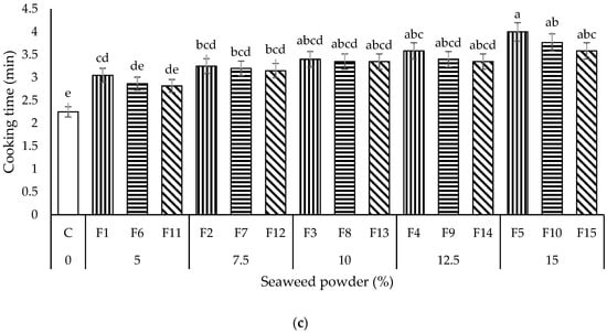 The optimum cooking time for noodles is when the noodles are completely gelatinized. The optimum cooking time of all the noodles samples is presented in Figure 1c. SP incorporated noodles’ cooking times ranged from 2.82 to 4.00 min, with noodle sample F5 having the highest cooking time. Regarding sustainability, noodles with a short cooking time are preferred [29]. Despite this, according to the Malaysia Standard MS 526-2009 [30], the maximum cooking time for instant noodles is 4 min, and hence, the cooking times of all our seaweed noodles samples are acceptable.