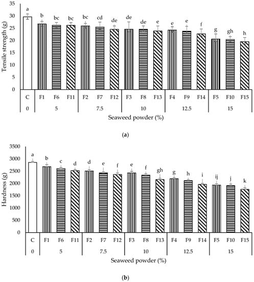 The instrumental textural properties effectively predict and elucidate the texture-related sensory acceptability of consumers toward the noodles. Noodles with good quality shall possess a value of tensile strength and hardness [5]. Therefore, a texture analyzer was utilized to measure the tensile strength and hardness of the cooked control and seaweed instant noodles.