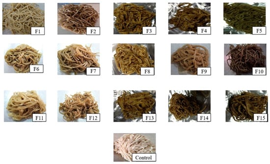 Color and appearance are important quality criteria for consumer acceptance in noodles products [21]. The appearances and color profiles of all the noodles samples prepared in this study are shown in Figure 4 and Figure 5, respectively. The control noodles (without seaweed) were visually observed to be the whitest, whereas the seaweed noodles varied in color from pale green to dark green (Figure 4).