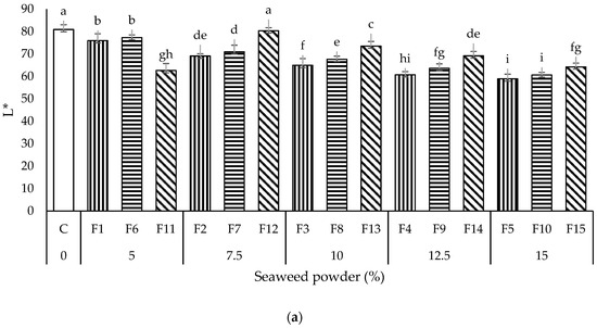 In general, all the formulated seaweed noodles had lower (p < 0.05) lightness (L* = 60.63–80.33), redness (a* = −2.67–0.02), and yellowness values (b* = 5.24–13.46), compared to the control noodles (L* = 80.88; a* = 0.18; b* = 18.53). All the L* values of seaweed noodles samples were significantly different (p < 0.05) from the control noodles except for noodles sample F12 (Figure 5a). Except for the noodles sample F11, the L* values of noodles samples had been observed to increase with the addition of PS. The incorporation of SP had obstructed the internal network structure of the noodles, reduced the light penetration, and hence, resulted in darker appearances [20]. Meanwhile, the increment in PS diluted the gluten protein content and weakened the noodle’s structure’s strength, thus producing noodles with a lighter color [33]. The addition of SP had remarkably (p < 0.05) reduced a* values compared to the control noodles, C. Among all the noodles samples, only noodles samples C and F15 showed a positive a* value (Figure 5b). The results showed that noodles sample F15 demonstrated more redness and less greenness than other seaweed noodles. The colors of noodles were closely related to the pigment composition in the seaweed and the processing procedures of the noodles. The redness color of F15 was provided by the phycocyanin, phycoerythrin, chlorophyll a, and xanthophyll pigments in red seaweed [23]. The low redness values of other seaweed noodles were probably due to the pigment’s degradation during the drying process [21]. The yellowness (b*) of noodles had also been observed to reduce (p < 0.05) with the incorporation of SP and decrease (p > 0.05) with the amount of PS in the formulations, from WF:PS ratio of 9:1 > 8:2 > 7:3 (Figure 5c). The decline in the yellowness of seaweed noodles was due to the discoloration of SP caused by the drying process during the noodles production and the higher clarity of PS compared to WF, respectively [34]. Decrement in L*, a*, and b* values of noodles after the incorporation of seaweed was also reported by Shahsavani and Mostaghim [20], Debbarma et al. [31], and Sholichah et al. [22].
