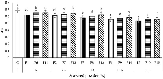 Water activity (aw) is the measurement of unbound water in a product and an indicator of food safety and quality. The aw value below 0.6 could prevent the spoilage of dried food by inhibiting microbial growth and slowing down most enzymatic and chemical reactions [19]. All the seaweed instant noodles samples exhibited significantly lower (p < 0.05) water activities (aw; 0.54–0.65) than the control noodles sample (0.63) (Figure 6). The addition of E. denticulatum SP significantly lowered the aw of noodles due to the SP’s high water holding capacity. The aw values of noodles were also observed to decrease (p < 0.05) when the amount of SP in the noodles’ formulation was increased from 5% to 10%, 12.5%, and 15%. As the amount of SP incorporated increases, more flour particles are available to attract and hold water in the noodles system, thus resulting in lower aw [15].