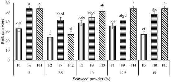 For the overall acceptability, both noodles samples F2 and F5, had significantly higher (p < 0.05) mean scores (both scored 4.63) than F12 (3.60). Overall, the panelists preferred noodles samples F2 and F5 more than F12. The remarkably higher overall acceptability scores of noodles samples F2 and F5 can be explained through their stronger (p < 0.05) mean scores obtained in the attributes of color, texture (elasticity), seaweed flavor, taste, and mouthfeel as compared to F12.