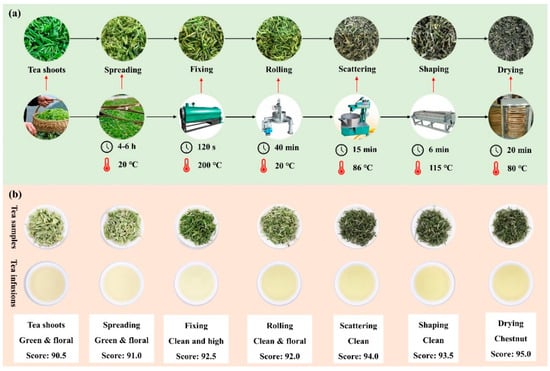 - Guo, X.; Ho, C.T.; Schwab, W.; Wan, X. Aroma profiles of green tea made with fresh tea leaves plucked in summer. Food Chem. 2021, 363, 130328. [Google Scholar] [CrossRef]