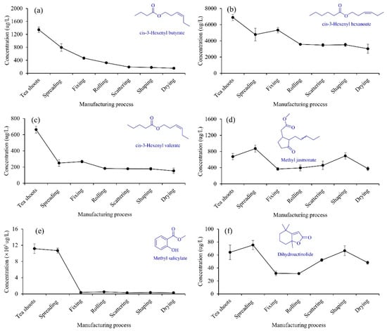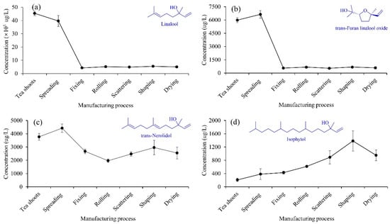 - Wang, C.; Lv, S.; Wu, Y.; Lian, M.; Gao, X.; Meng, Q. Study of aroma formation and transformation during the manufacturing process of Biluochun green tea in Yunnan Province by HS-SPME and GC-MS. J. Agri. Food Chem. 2016, 96, 4492–4498. [Google Scholar] [CrossRef]