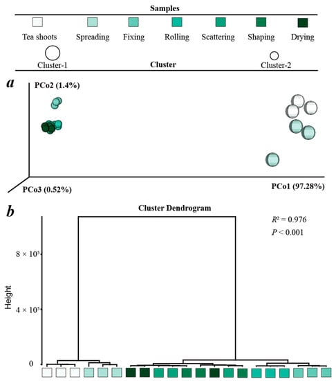- Pang, X.; Yu, W.; Cao, C.; Yuan, X.; Qiu, J.; Kong, F.; Wu, J. Comparison of potent odorants in raw and ripened pu-erh tea infusions based on odor activity value calculation and multivariate analysis: Understanding the role of pile fermentation. J. Agri. Food Chem. 2019, 67, 13139–13149. [Google Scholar] [CrossRef]