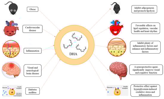 | Anti-inflammation | DHA | Changed the secretion of adipokine in 3T3-L1 cells and had an anti-inflammatory effect | [28] |