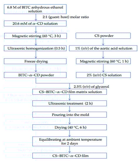 Figure 1. Procedures of fabricating the CS−BITC−α−CD composite film.