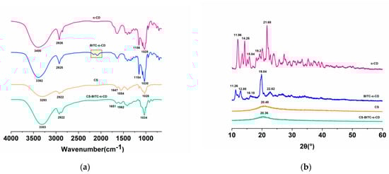 Figure 2. Characterization of inclusion complex and CS−based composite film. (a) FTIR spectra of α-CD, BITC−α−CD, CS, and CS−BITC−α−CD; (b) XRD patterns of α−CD, BITC−α−CD, CS, and CS−BITC−α−CD.