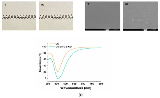 Figure 3. Appearance, light transmittance and surface morphology of the pure CS and CS−based composite films. Appearance of (a) pure CS and (b) CS−BITC−α−CD composite films; (c) UV–vis spectra; surface morphology of (d) pure CS and (e) CS−BITC−α−CD composite films.
