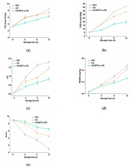 Figure 4. Changes of beef samples wrapped with pure CS and CS−based composite films during storage. (a) TVC; (b) TVB−N; (c) pH; (d) TBARS; (e) sensory evaluation.
