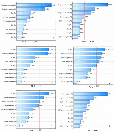Pareto charts for the effect of sonication on S.O.D. (superoxide dismutase) (a), C.A.T. (catalase) (b), A.P.X. (ascorbate peroxidase) (c), H2O2 (hydrogen peroxide content) (d), P.O.D. (peroxidase) (e), P.P.O. (polyphenol oxidase), and (f) activities of cashew apple bagasse.