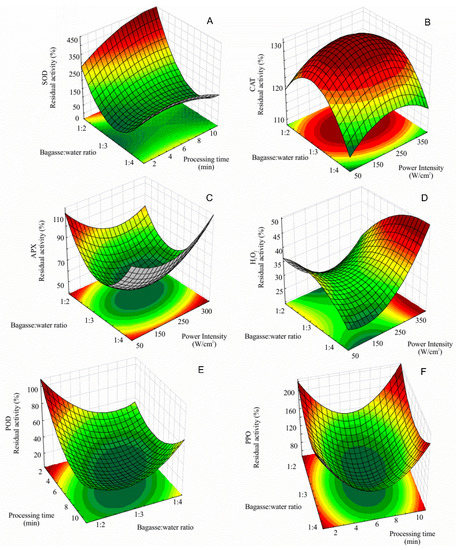 The fitted model for residual S.O.D. activity as a function of bagasse: water ratio, U.S. power intensity, and the processing time is expressed in Table S1. An inflection point on the surface shows a local minimum for processing time and a local maximum for bagasse: water ratio (Figure 2a). When the processing time was ≈6 min, S.O.D. residual activity increased for bagasse: water ratio higher and lower than 1:3. A similar result was found for U.S. processing of bayberry juice by Cao et al. [] with an increment of S.O.D. activity processed at 90–450 W/cm2 for 4 min was observed.