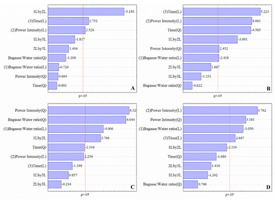 Pareto charts for the effect of sonication on luminosity (L) (A); hue angle (h°) (B); Chroma (ΔC) (C); and total color difference (ΔE) (D) of sonicated cashew apple bagasse (C.A.B.).