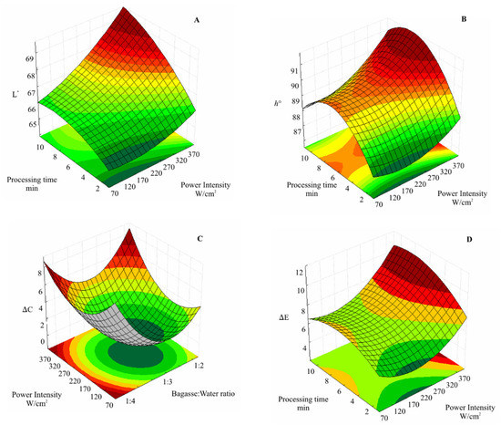 Response surface for the effect of sonication on luminosity (L*) (A); hue angle (h°) (B); Chroma (ΔC) (C); and total color difference (ΔE) and (D); of sonicated cashew apple bagasse (C.A.B.).