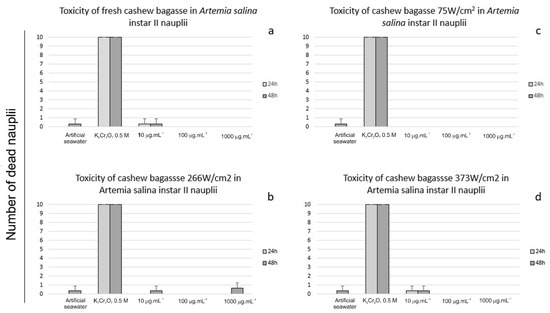 No significant acute toxicity was noted in unprocessed (Figure 5a), 75 W/cm2 (Figure 5b), 266 W/cm2 (Figure 5c), or 373 W/cm2 (Figure 5d) sonicated cashew bagasse at 24 or 48 h of exposure. The number of dead nauplii was higher at 48 h in all treatments.