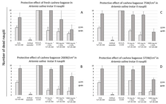 No significant protective effect was observed for unprocessed (Figure 6A), 75 W/cm2 (Figure 6B), 226 W/cm2 (Figure 6C), or 373 W/cm2 (Figure 6D) sonicated cashew bagasse at 24 or 48 h of exposure. However, cashew bagasse processed at 75 W/cm2 (1000μg/mL) prevented nauplii death after 24 h of exposure (Figure 6A). This data cannot assure the protective effect once the number of dead nauplii on 100 μg/mL (Figure 6B) was similar. However, these data indicate a possible protective effect, especially in higher cashew bagasse concentrations. In general, the protective effect is dose-dependent, as Miguel et al. [] described. Unlike C.A.B., other vegetable drinks such as blueberry juice [] and fruit wines [] also promoted a protective effect against oxidative stress. The number of dead nauplii was higher at 48 h at all treatments. According to Miguel et al. [], 127.45 mM H2O2 is the lethal concentration for a 24 h experiment. H2O2 at LC50 (127.45 mM) causes the death of nearly 50% of individuals at 24 h exposure. After 24 h of exposure to H2O2 (127.45 mM) almost all nauplii were dead.
