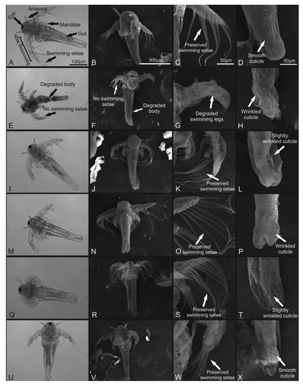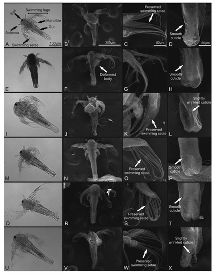 Optical and scanning electron microscopy of A. salina nauplii within 24 h exposure on acute toxicity test. (A–D) Negative control (artificial seawater); (E–H) positive control (K2Cr2O7 0.5 M); (I–L) fresh cashew bagasse 1000 μg/mL; (M–P) 75 W/cm2 cashew bagasse 1000 μg/mL; (Q–T) 226 W/cm2 cashew bagasse 1000 μg/mL; (U–X) 373 W/cm2 cashew bagasse 1000 μg/mL. Note severe damage on nauplii exposed to K2Cr2O7. Bars: (A,E,I,M,Q,U)—500 μm; (B–D,F–H,J–L,N–P,R–T,V–X)—50 μm.