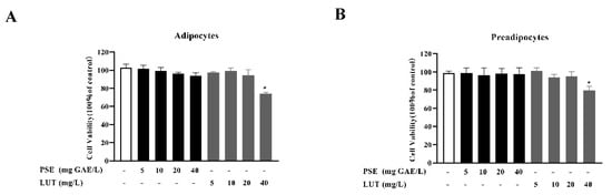 The cell viability of the 3T3-L1 cells in the (A) preadipocytes and (B) adipocytes treated with PSE and LUT or a vehicle 48 h after cell plating. Data are presented as mean ± SD from three independent experiments. * Significant differences are indicated by p < 0.05.