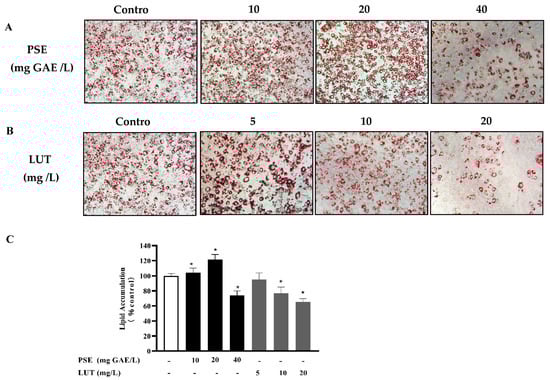 The effect of PSE and LUT on lipid accumulation in 3T3-L1 adipocytes was measured using Oil Red O staining. As shown in Figure 2A,C, the modulatory effect of PSE on adipogenesis was biphasic. At lower concentrations of 10 mg GAE/L and 20 mg GAE/L, the PSE significantly promoted lipid accumulation, while the opposite was evident at 40 mg GAE/L. As shown in Figure 2B,C, intracellular lipid accumulation significantly decreased in a dose-dependent manner in the LUT-treated groups. Furthermore, 5 mg/L LUT had no significant inhibitory effect on lipid accumulation. Concentrations of up to 10 mg/L of LUT resulted in a significant lipid accumulation effect compared with the control. Lipid accumulation was reduced by 22.9% and 34.6%, respectively, at 10 mg/L and 20 mg/L LUT.