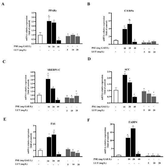 PSE and LUT modulated the expression of mRNA involved in adipogenesis in the 3T3-L1 adipocytes. The relative mRNA expressions of (A) PPARγ, (B) C/EBPα, (C) SREBP1-C, (D) ACC, (E) FAS, and (F) FABP4. The data are presented as the mean ± S.D. from three independent experiments. * Significant differences are indicated by p < 0.05.