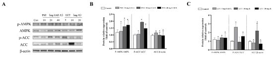 PSE and LUT modulated the expression of the phosphorylation of AMPK and ACC in the 3T3-L1 adipocytes. (A) Western blot results for the phosphorylation of ACC and AMPK. Quantification of pACC/ACC, pAMPK/AMPK, and ACC/β-actin after (B) PSE and (C) LUT treatments. The data are presented as the mean ± SD from three independent experiments. * Significant differences are indicated by p < 0.05.