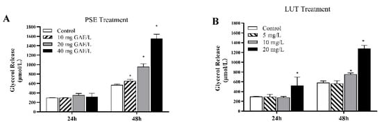 The effect of PSE and LUT on adipocyte lipolysis. Fully differentiated adipocytes treated with various concentrations of (A) PSE (0 mg GAE/L, 10 mg GAE/L, 20 mg GAE/L and 40 mg GAE/L) and (B) LUT (0 mg/L, 5 mg/L, 10 mg/L and 20 mg/L) for 24 h and 48 h, respectively. The data are presented as the mean ± SD from three independent experiments. * Significant differences are indicated by p < 0.05.