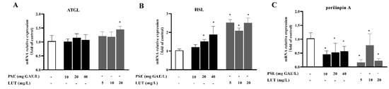 PSE and LUT modulated the expression of the mRNA involved in the lipolysis of the 3T3-L1 adipocytes. The relative mRNA expression of (A) ATGL, (B) HSL, and (C) Perilinpin A. The data are presented as the mean ± SD from three independent experiments. * Significant differences are indicated by p < 0.05.